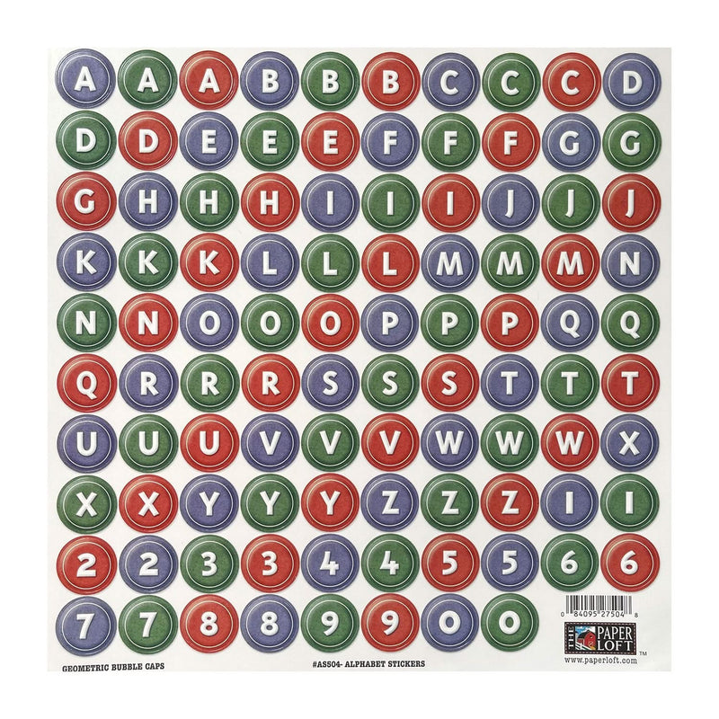 The Paper Loft 12"x 12" Cardstock Alphabet Stickers - Geometric Bubble Caps #4. This package contains one 12" x 12" (30.5cm x 30.5cm) sheet of cardstock alphabet stickers, numbers and punctuation marks.
