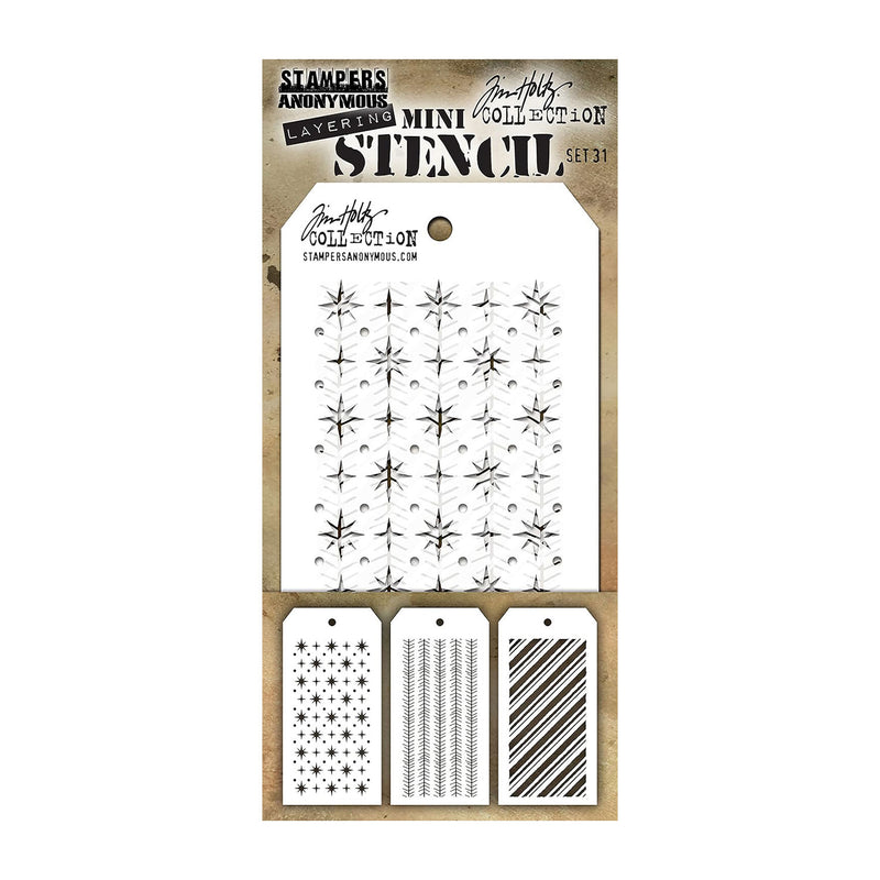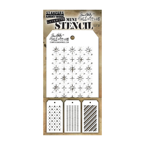 Tim Holtz Mini Layering Stencil Set 3 Pack #31 - Add dimension to a project by using colour variations or different colours in the open spaces of the stencils. Use the stencils with a variety of mediums to add texture. Perfect for art journals, card making, mixed media and additional projects. This 3.5x7.5 inch package contains three assorted stencils. Comes in a variety of designs.