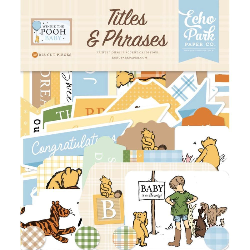 Echo Park Ephemera Titles & Phrases, Winnie The Pooh Baby - Craft heartfelt projects with the Winnie The Pooh Baby Collection Titles And Phrases Ephemera by Echo Park. This set includes 32 playful die-cut pieces featuring baby-themed sentiments like "Rock-A-Bye Baby" and "Bundle of Joy." These versatile pieces are perfect for baby showers, keepsake albums, and more!