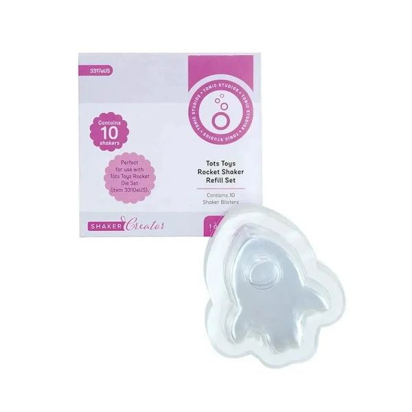 Tonic Studios Tots Toys Shaker Domes - Rocket. Add a bit of fun and dimension to your craft projects with these toy-shaped shaker sets. Look out for your Tots Toys Die & Shaker sets designed to perfectly fit your toy shakers. Pack includes 10 Rocket-shaped blister refills. Size: 2"x 2.5".
