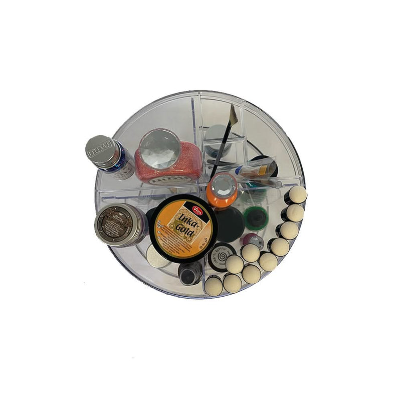 Universal Crafts 360 Rotating Craft Tower - Get your crafty supplies stored and organised in the Universal Crafts 360 Craft Tower! This rotating organiser comes with a handy top rack and base shelves and 4 adjustable shelves to customise how you store your most treasured products. You won't believe how much this can hold! This clear craft storage tower is filled with endless combinations of shelf positions and will soon be filled with all your favourite small supplies and tools. Just think of all the bottles, jars, inks, markers, washi tapes, blending tools and more that want to call this beautiful tower home! Assembled organiser measures 12" (30.5cm) high with a 9" (22.9cm) diameter.