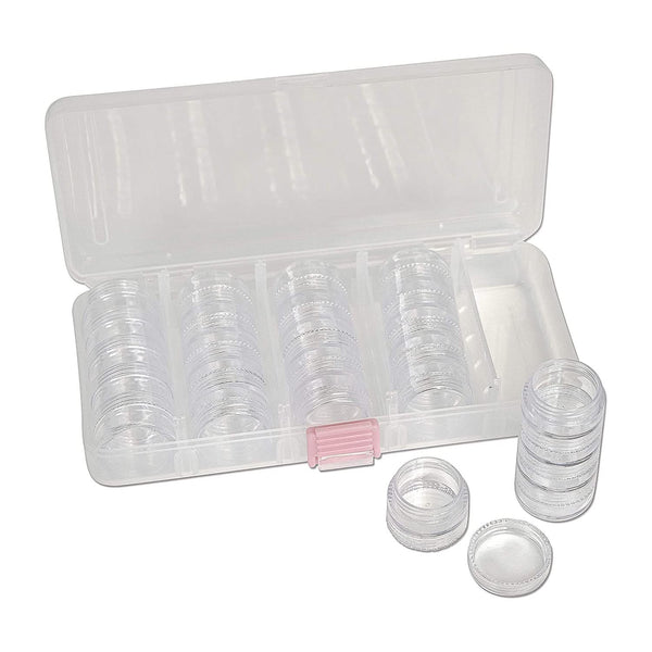 Universal Crafts Bead Storage Container - 25 Small Jars. Keep all your crafting and beading supplies in one neat and organised spot thanks to this storage box from Universal Crafts. Made of clear plastic, all your beads and supplies are easy to see and stay in one spot. With a clear lid that snaps shut, the box allows you to see at a glance what you have in on hand. This assorted storage solution includes 25 Small stackable screw top jars that fit inside the box. Container Size: 19cm long x 9cm wide x 4cm deep. Single Jar Size: 1.5cm x 3cm.