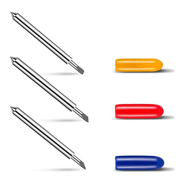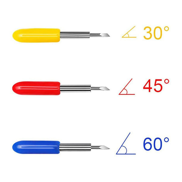 - You will get 9 PCS replacement blades suitable for Explore air and Maker series cutting machine, including 3 PCS 30 degree fine point cutting replacement blades (yellow cap)+3PCS 45 degree standard blades (red cap)+3 PCS 60 degree deep cut blade (blue cap).