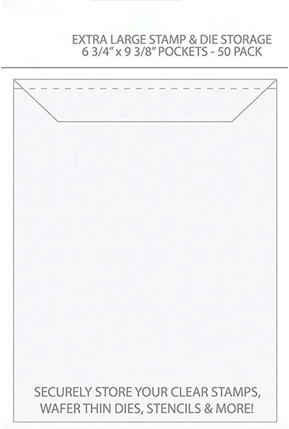 Universal Crafts Stamp and Die Storage Pockets - Extra Large (17cm x 24cm) 50 pack. These sturdy and durable plastic pockets are perfect for storing your dies and stamps. 6 -3/4 x 9 -3/8 inches