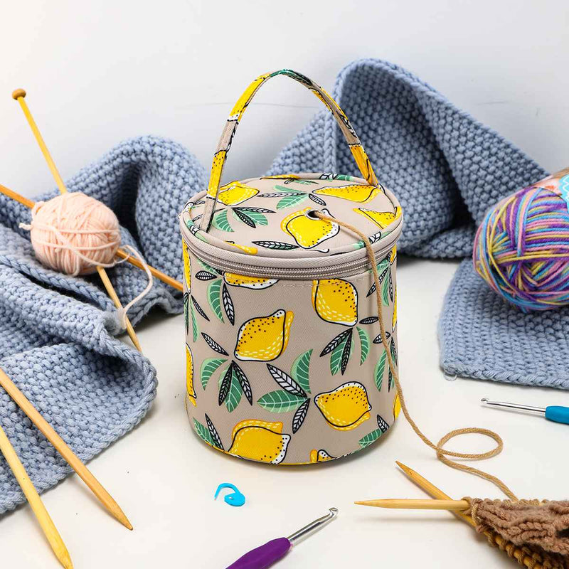 Universal Crafts Yarn Storage Bag #10 - Zesty Lemon. Keep your yarn organised with Universal Crafts' Knitting Yarn Storage Bag. Featuring a zipper closure, a carry handle and an eyelet in the lid to feed out your yarn. This knitting yarn bag is perfect for keeping your projects going at home or on the go. Available in a range of different colours, each sold separately. Size: 13cm x 14cm. Contents of bag are not included.