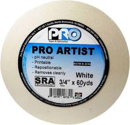 Pro Artist tape-premium flatback paper tape. Used for color coding, labeling. Printable with: flexo inks, markers, pens and pencils. Repositionable, clean removal, leaves no residue, easy unwind and high edge tear resistance. White color is PH neutral.