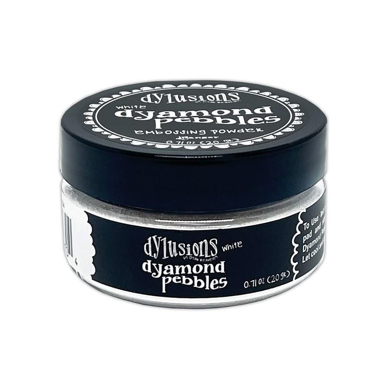 Dyan Reaveley Dylusions Dyamond Pebbles White - Embossing Powder - Add dimension to your stamped images with Dylusions Dyamond Pebbles. Create the perfect outline for colouring with Dylusions Dyamond Dust, Dylusions Inks and other mediums. For use with Dyamond Dust, Rocks, Mediums, Boards, Stamps and more. To Use: Ink your stamp image with Dylusions Dyamond medium pad. Stamp onto card stock and sprinkle over the Dylusions Dyamond pebbles. Replace excess pebbles into jar. Heat gently with the Ranger heat tool to raise the image. Colour with chosen medium. Available in a variety of colours, each sold separately.